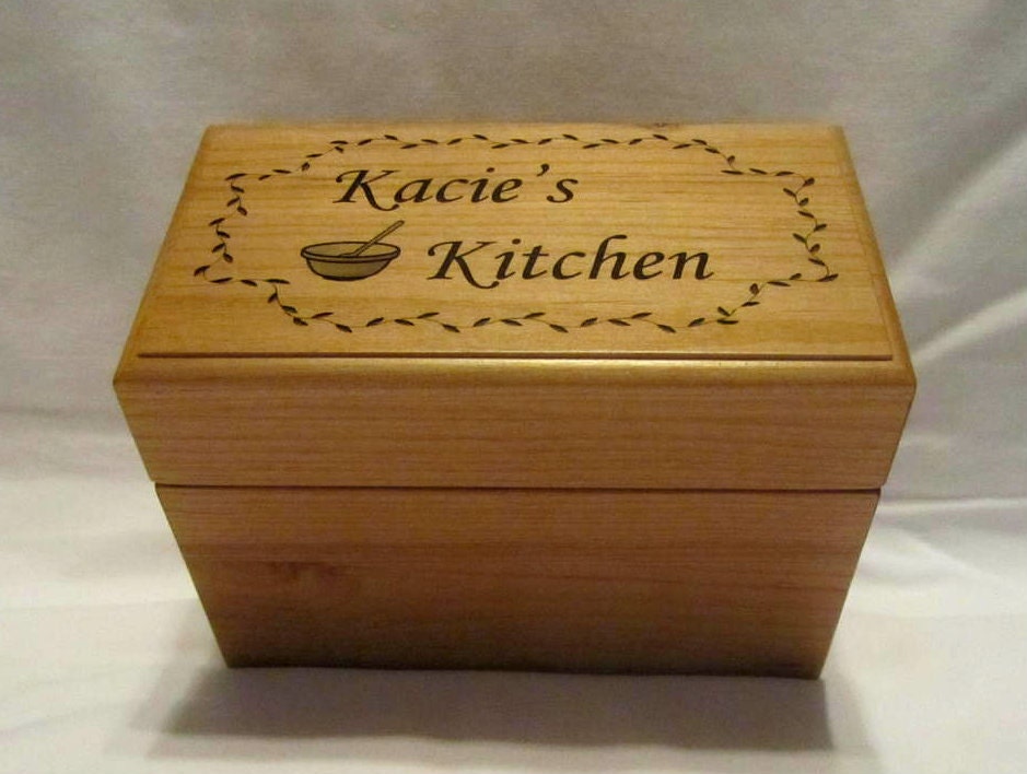 This recipe box will include personalized engraving of your choice. This lustful treasure box, ahem, recipe card box holds up to 500 recipe cards and comes with oh, and did we mention the top of the box comes with a built in groove to stand each recipe card? Your favorite recipes are saved to your browsers cookies. You've spent time crafting interesting reports, so why not create an. Buy top selling products like circular vine bamboo recipe box and circular vine leaves established date bamboo recipe box. Recipe boxes have always been an excellent keepsake for your secret family recipes. Showing results for personalized recipe box. Make this recipe box personal to whomever you give it to (or yourself!) write up to 50 letters (fewer letters will allow us. Keep your favorite recipes safe and organized in a personalized,engraved recipe box from giftsforyounow.com. There's no better place to store your favorite family recipes than in a beautiful recipe box or book. If you clear cookies, your favorite posts will be deleted. A beautiful wooden recipe box engraved with a cherry blossom branch. What makes ours different is that they are personalized to match a persons name or last name.